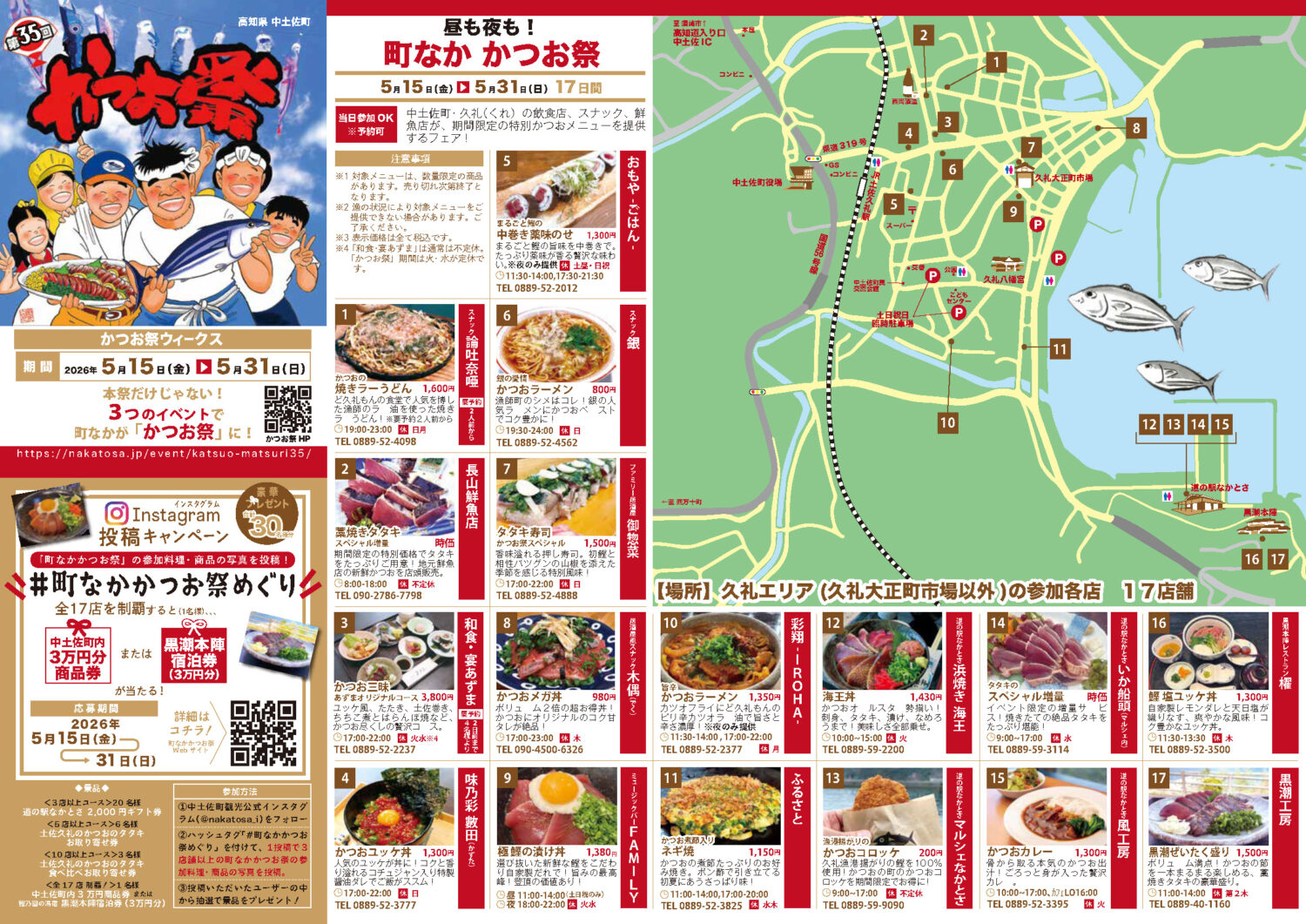 インスタグラムにて「#町なかかつお祭めぐり」を付けて、町なか かつお祭参加店舗(17店舗)の参加料理の写真を投稿すれば抽選で豪華景品が当たるキャンペーン!